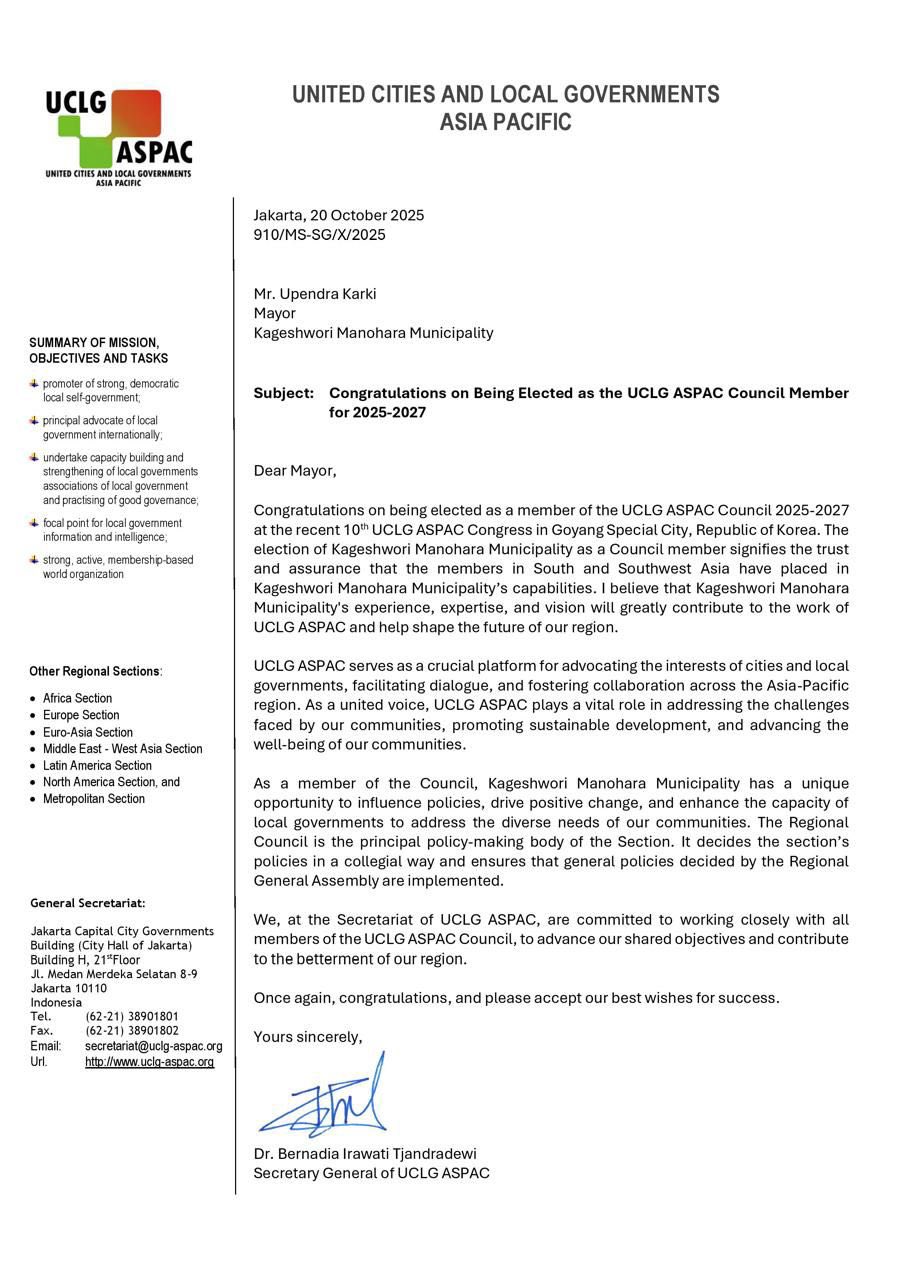 कागेश्वरी मनोहरा नगरपालिकाका नगरप्रमुख उपेन्द्र कार्की संयुक्त शहर तथा स्थानीय सरकार एशिया–प्रशान्त (UCLG ASPAC) को २०२५–२०२७ कार्यकालका लागि परिषद् सदस्यमा निर्वाचित हुनुभएको छ।