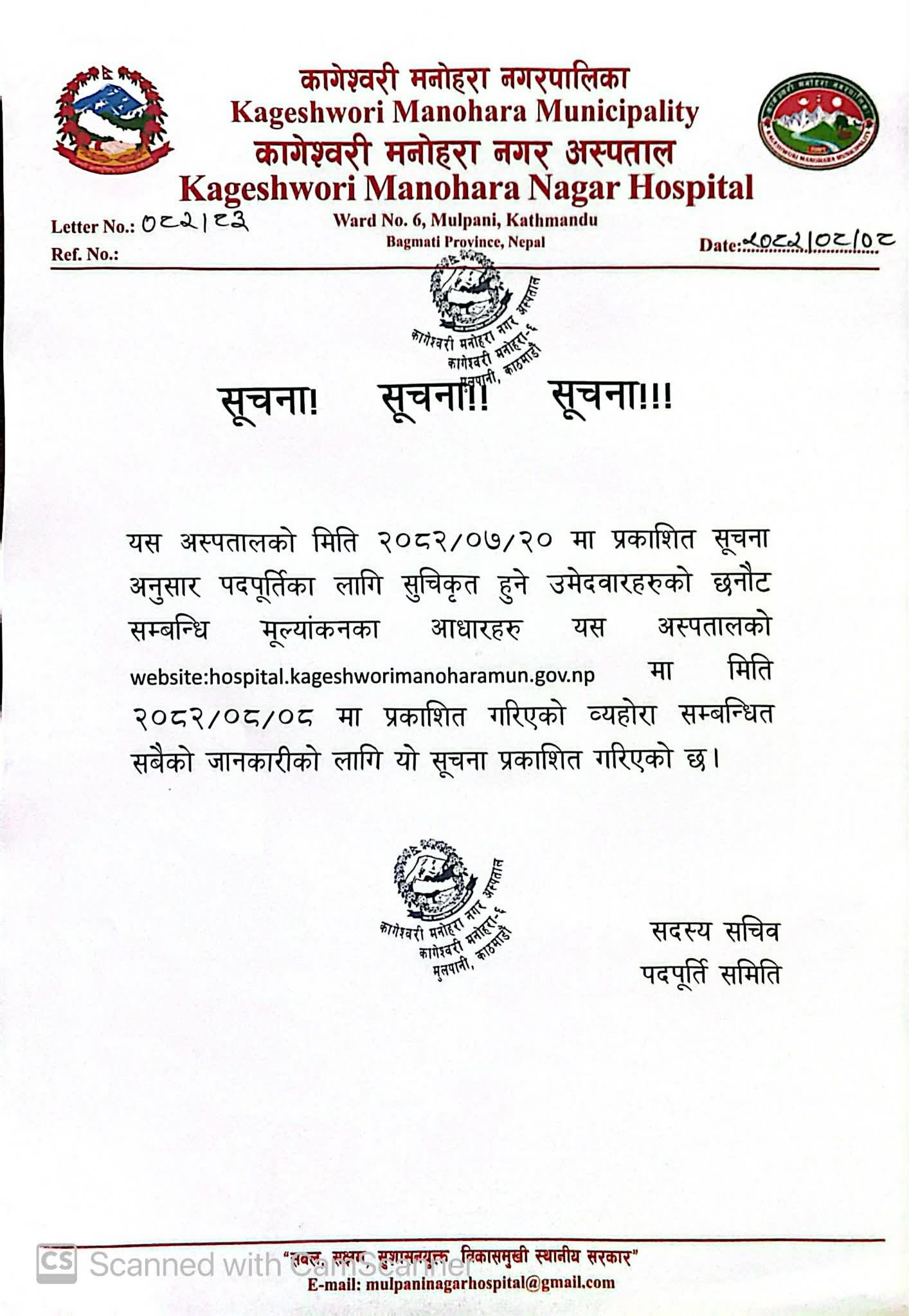 अस्पतालले वेबसाइट hospital.kageshworimanoharamun.gov.np मा मिति २०८२/०८/०८मा अपलोड गरिएको विवरण हेरी पदपूर्ति प्रक्रियाबारे आवश्यक जानकारी लिन सबैलाई अनुरोध गरेको छ।