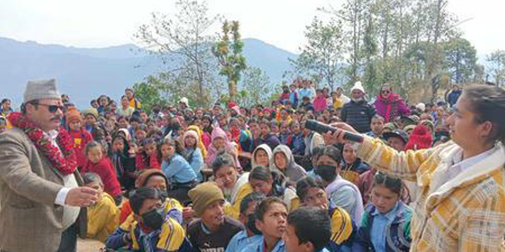 दैलेख, १६ फागुन : नारायण नगरपालिकाले विद्यालयका बालबालिकासँग नगरप्रमुख कार्यक्रम कार्यान्वयनमा ल्याएको छ । विद्यालयमा देखिएका समस्यासँगै बालबालिकाले भोग्दै आएका व्यवहारिक कुरालाई नीतिगतरूपमा समाधान गर्ने उद्देश्यले नगरपालिकाले विद्यालयका बालबालिकासँग नगरप्रमुख कार्यक्रम ल्याएको हो । नारायण –११ टाटामाखु स्थित रैनादेवी माध्यमिक विद्यालयबाट सञ्चालन गरिएको सो कार्यक्रमको मुख्य ध्येय बालबालिकाले विद्यालयमा भोग्दै आएका समस्या समाधान गर्ने, उनीहरूमा […]